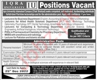 Vacancies in Iqra University Islamabad Advertisement December 2022