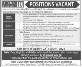 Vacancies in Iqra University Islamabad Advertisement August 2021