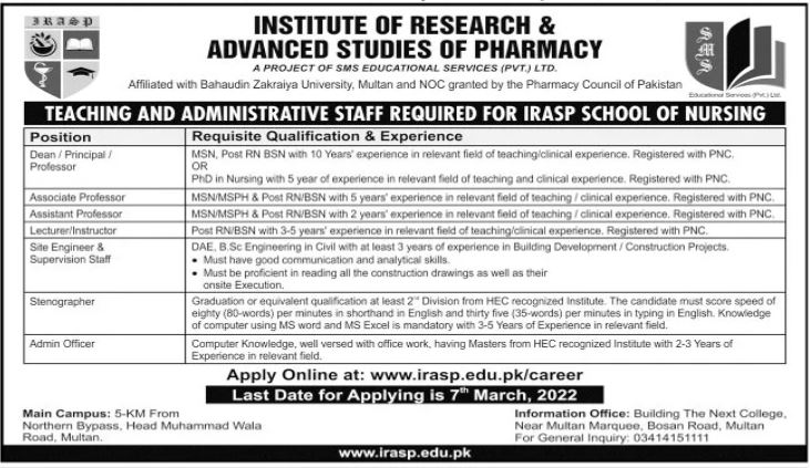 Institute of Research & Advanced Studies of Phamcay IRASP is looking for candidates for following posts as per job advertisement published in daily Jang Newspaper of February 20, 2022 for location Multan, multan Punjab Pakistan: