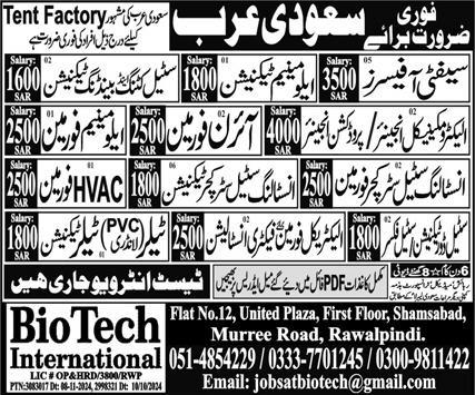 BioTech International Riyadh, dammam Saudi Arabia invites applications from eligible candidates for the post of electro mechanical engineer, laundry tailor, safety officer, steel cutting technician, iron foreman, installing steel structure technician, aluminum foreman, aluminum technician, steel fixer, bending technician, tailor, installing steel structure foreman, hvac foreman, electrical foreman, steel door technician, production engineer and pvc tailor as per advertisement of February 4, 2025 published in daily Express Newspaper. Educational qualifications required Bachelor, Intermediate, DAE, B.E and Matric etc.