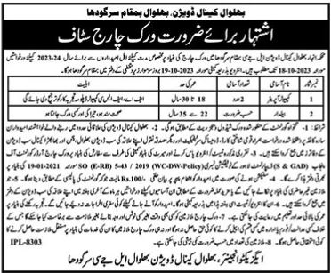 Bhalwal Canal Division, Irrigation Department invites applications for job positions advertised in daily The News dated 10 October 2023 for following vacancies in Sargodha, sargodha Punjab Pakistan.