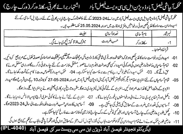 Irrigation Department jobs advertisement dated about 9 May 2024 in daily Nawaiwaqt Newspaper invites application for the vacant post of skilled worker in Faisalabad, faisalabad Punjab Pakistan. Educational qualifications required Matric, Primary and Middle etc.