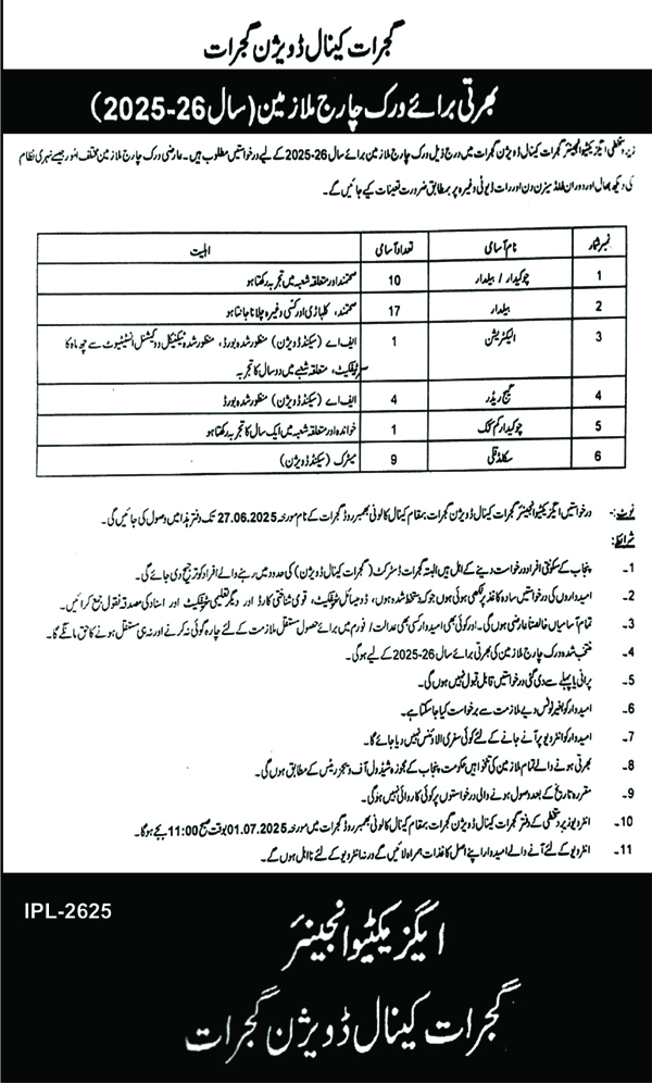Gujrat Canal Division, Irrigation Department Gujrat, gujrat Punjab Pakistan invites applications from eligible candidates for the post of guage reader, baildar, skilled coolie, electrician, chowkidar and cook as per advertisement of June 17, 2025 published in daily Nation Newspaper. Preferred Education is Primary, Intermediate and Matric etc.