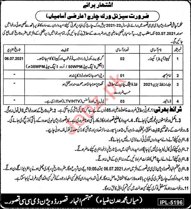 Irrigation Department Kasur Canal Division DCC Jobs 2021