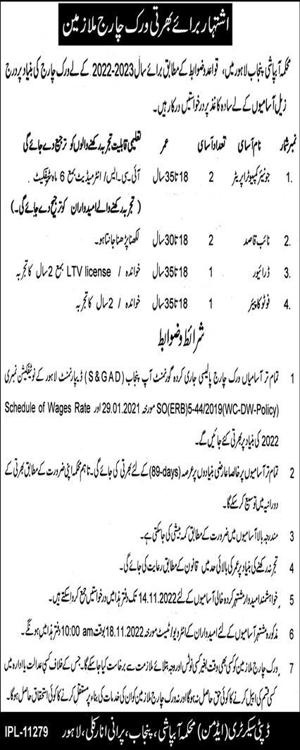 Vacant posts including naib qasid, computer operator, ltv driver, photocopier and driver are announced in Irrigation Department Lahore, lahore Punjab Pakistan as per 5 November 2022 advertisement in daily Express Newspaper. Persons with Intermediate and Primary etc. education can apply.