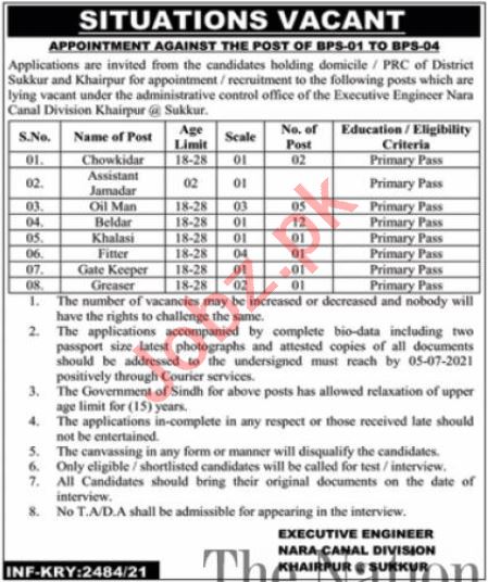 Irrigation Department Nara Canal Division Khairpur Jobs 2021
