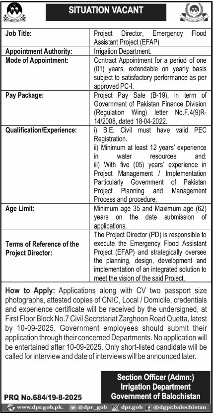 Irrigation Department jobs advertisement dated about 21 August 2025 in daily Other Newspaper invites application for the vacant post of project director in Quetta, quetta Balochistan Pakistan. Candidates with MS, Master and Bachelor etc. educational background will be preferred.
