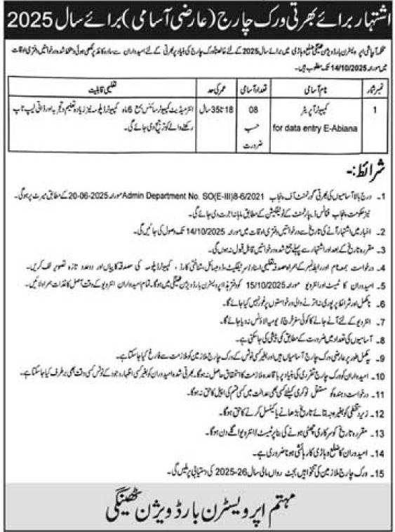 Irrigation Department jobs advertisement dated about 13 October 2025 in daily Daily Pakistan Newspaper invites application for the vacant post of computer operator in Charsadda, charsadda Khyber Pakhtunkhwa KPK Pakistan. Persons with Intermediate etc. education can apply.