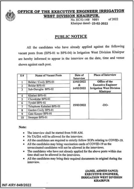 Irrigation Department invites applications for job positions advertised in daily Jang dated 27 February 2022 for following vacancies in Khairpur, khairpur Sindh Pakistan.