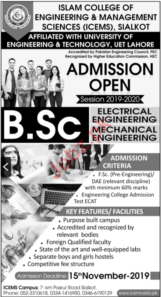 Islam College of Engineering & Management Sciences has announced admissions in B.Sc Electrical Engineering and B.Sc Mechanical Engineer in Sialkot. Last date for admission is 15 November, 2019. Read newspaper ad for exact details.