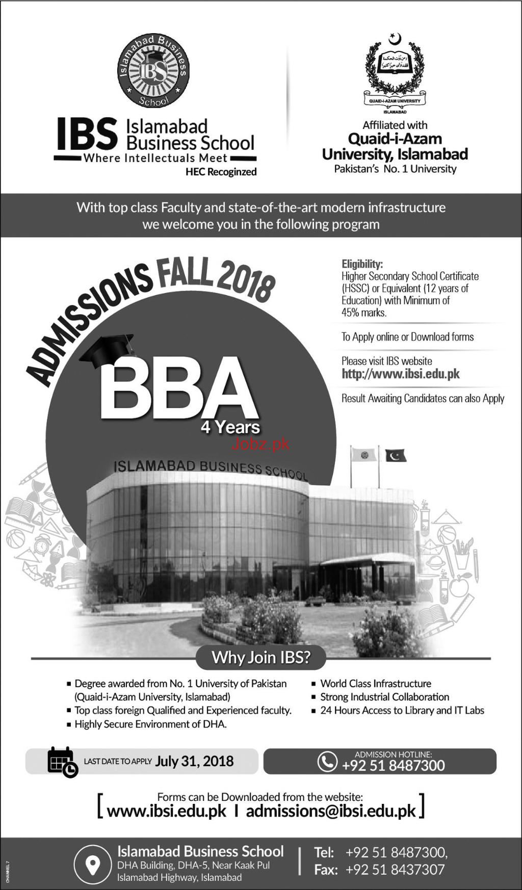 Islamabad Business School IBS Admission in BBA Four Year Program in Islamabad. The Submission of application along with required is 31 July 2018. Admission Open for Both Male / Female Students Read newspaper ad for exact details.
