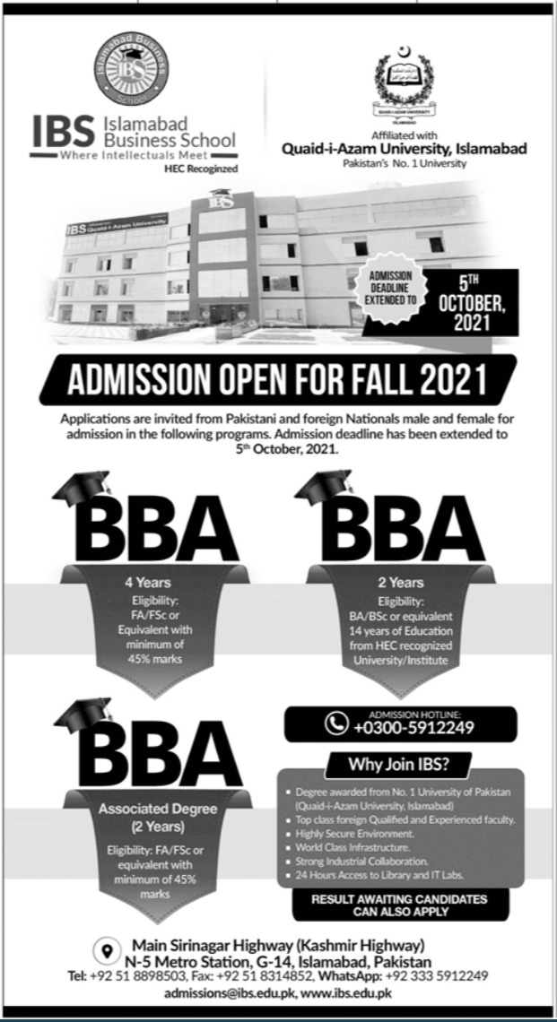 Islamabad Business School IBS affiliated with Quaid I Azam University Islamabad has announced admissions in Bachelor of Business Administration BBA Degree Programs 2021. Read newspaper ad for exact details.