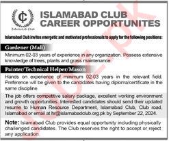 Islamabad Club Islamabad, islamabad Islamabad Pakistan invites applications from eligible candidates for the post of technical helper, gardener, mali, painter and mason as per advertisement of September 8, 2024 published in daily Jang Newspaper. Preferred Education is Primary, Middle, Matric and Intermediate etc.