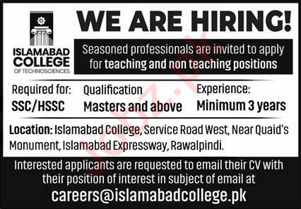 Vacant posts including non teaching staff and teaching staff are announced in Islamabad College of Technosciences Islamabad, islamabad and rawalpindi Islamabad Pakistan as per 11 June 2023 advertisement in daily Express Newspaper. Bachelor, Master and MS etc. educational qualification will be preferred.