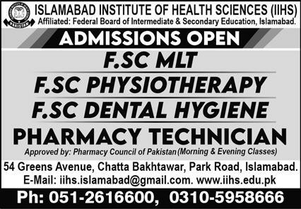 Admissions in Islamabad Institute of Health Sciences IIHS 2022 for Fsc, MLT, Fsc Physiotherapy, FSc Dental Hygiene, Pharmacy Technician has been announced. Islamabad Institute of Health Sciences IIHS Islamabad Islamabad Pakistan welcomes students to apply for admissions in academic year 2022 in Medical College. Students for admissions in Intermediate and Diploma can apply for online or campus classes as per Government institute criteria till admission closing date November 30, 2022. Read newspaper ad for exact details.
