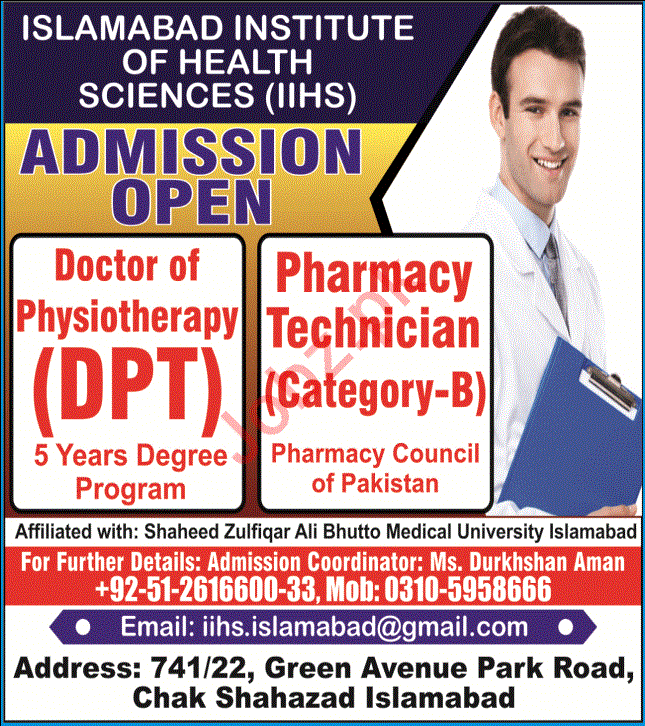 Islamabad Institute of Health Sciences IIHS affiliated with Shaheed Zulfiqar Ali Bhutto Medical University Islamabad is offering admissions for Doctor of Physiotherapy DPT & Pharmacy Technician. Read newspaper ad for exact details.