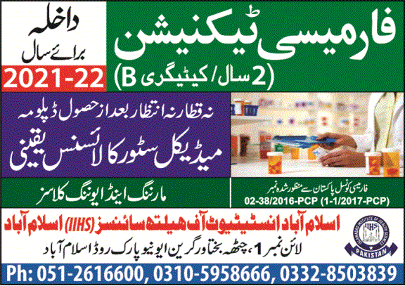 Islamabad Institute of Health Sciences IIHS has announced admissions for 2 Year paramedical diploma in Pharmacy Technician in Islamabad Pakistan 2021. Read newspaper ad for exact details.