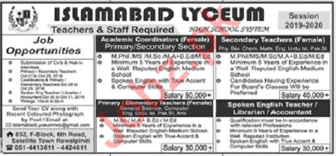 Vacancies in Islamabad Lyceum Advertisement October 2019