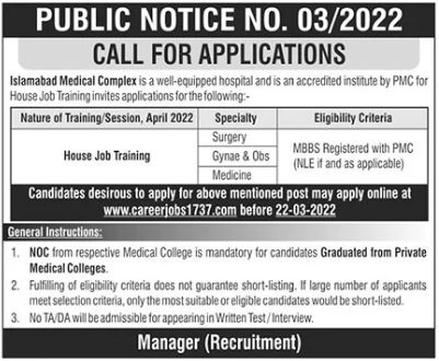 Islamabad Medical Complex latest Private Medical jobs and others can be applied till 22 March 2022 or as per closing date in newspaper ad. Read complete ad online to know how to apply on latest Islamabad Medical Complex job opportunities.