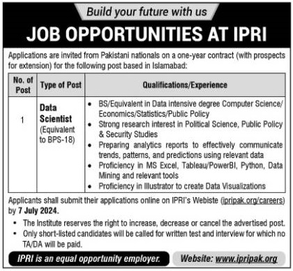 Islamabad Policy Research Institute IPRI Islamabad, islamabad Islamabad Pakistan invites applications from eligible candidates for the post of data scientist as per advertisement of June 27, 2024 published in daily Nation Newspaper. Preferred Education is Bachelor etc.