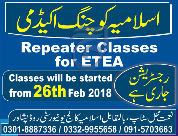 Islamia Coaching Academy Admission in Repeater Classes for ETEA Preparation in Peshawar. Classes will be started from 26- February 2018. Registration open. Read newspaper ad for exact details.