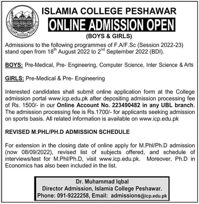 Islamia College Peshawar Intermediate Admissions 2022