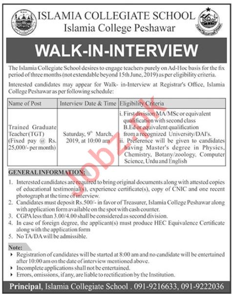 Islamia Collegiate School Peshawar Teacher Jobs 2019