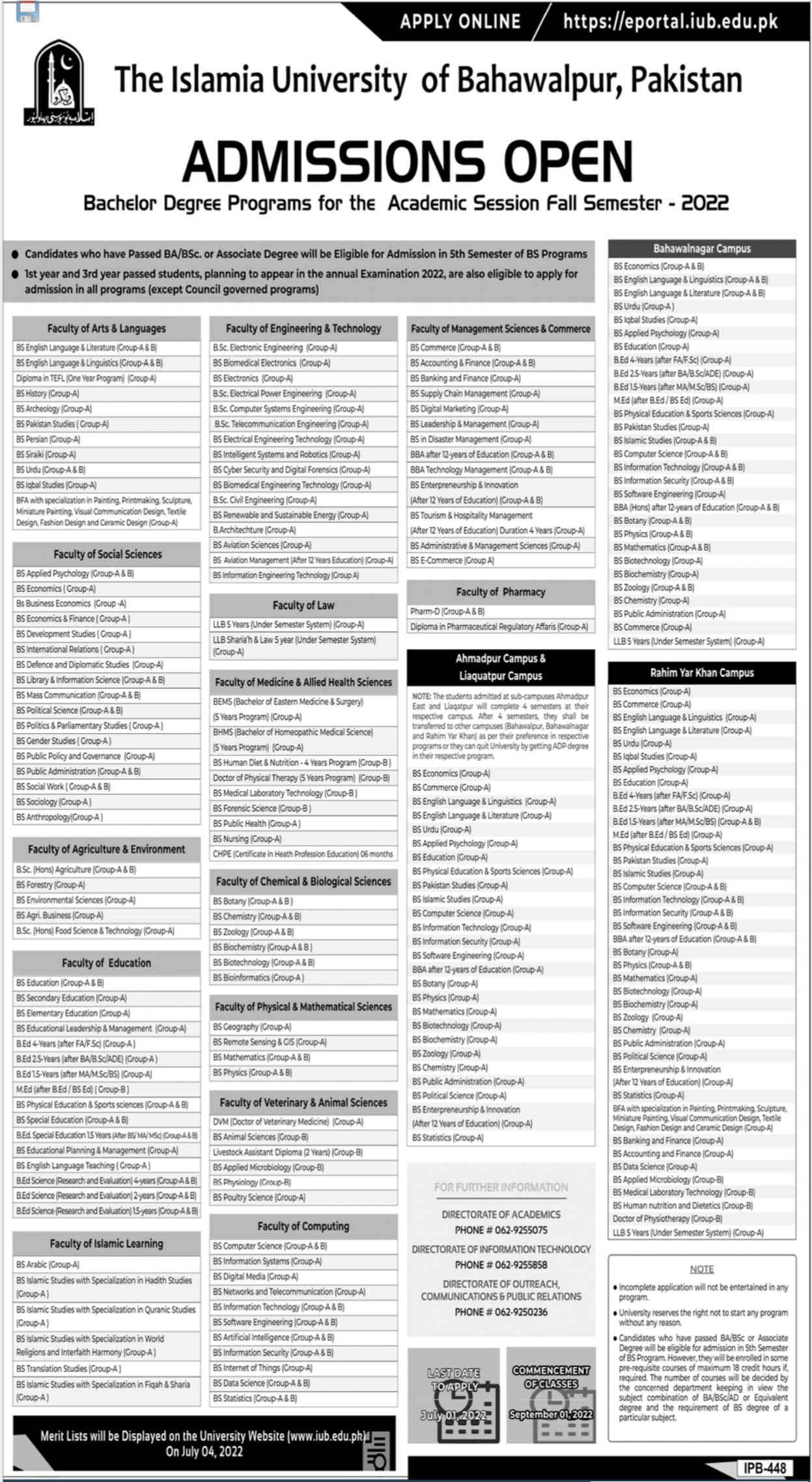 The Islamia University of Bahawalpur BS in English Linguistics, English Literature, History, Archaeology, Pakistan Studies, Persian, Siraiki, Urdu, Iqbal Studies, BFA, Diploma in TEFL, Bsc in Electrical Engineering, BS in Biomedical Electronics, Electronics, BSc in Electrical Power Engineering, Computer System Engineering, Telecommunication Engineering, BS Electrical Engineering Technology, admissions 2022 has been announced. Eligible students can apply for academic admissions 2022 in The Islamia University of Bahawalpur Multan Rahim Yar Khan, and Bahawalnagar Punjab Pakistan for Science University. Eligible candidates for admissions in BS, DVM, Others, Diploma, LLb, BSc Hons and Pharm D can apply as per Government institute criteria and before closing date 1 July 2022 after reading advertisement online. Read newspaper ad for exact details.