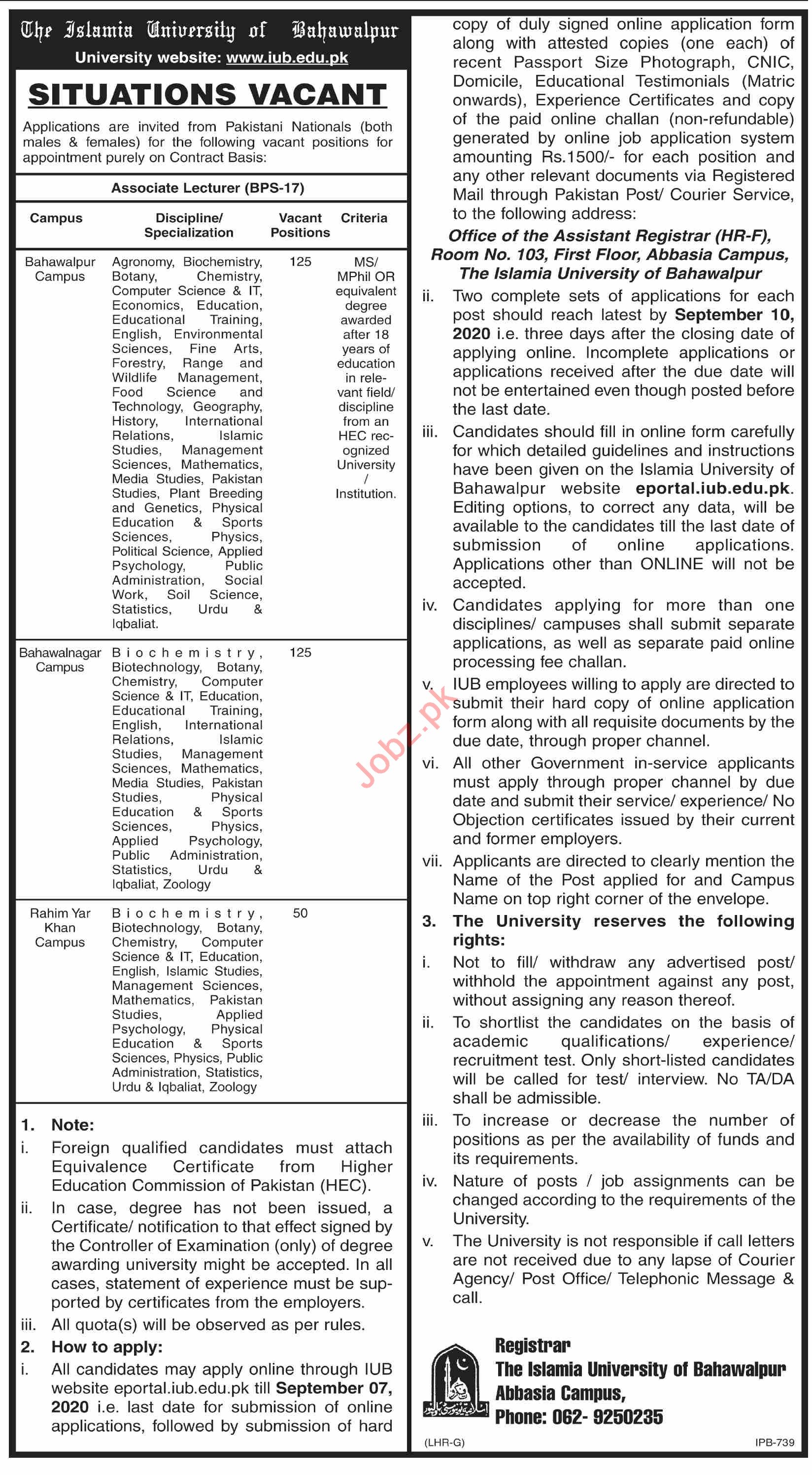 Vacancies in The Islamia University of Bahawalpur Advertisement August 2020