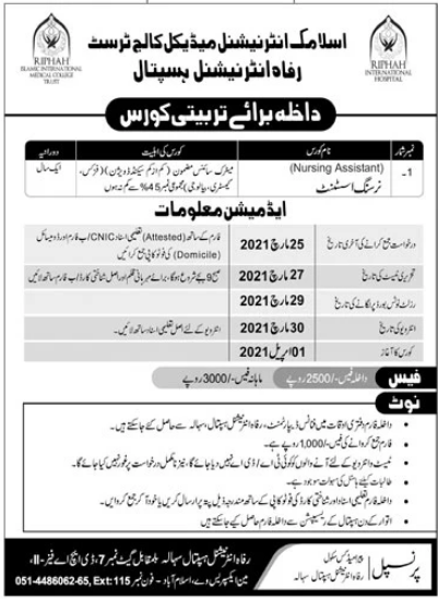 Islamic International Medical College Trust, Riphah International Hospital has announced admissions for courses in Nursing Assistant in Islamabad Pakistan 2021. Read newspaper ad for exact details.