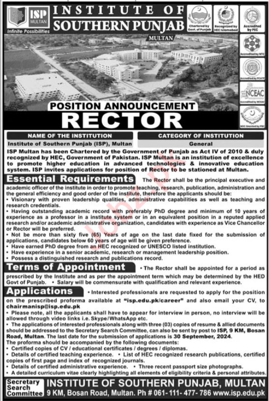 Institute of Southern Punjab ISP jobs advertisement dated about 8 September 2024 in daily Jang Newspaper invites application for the vacant post of rector in Multan, multan Punjab Pakistan. Preferred Education is Mphil and Master etc.