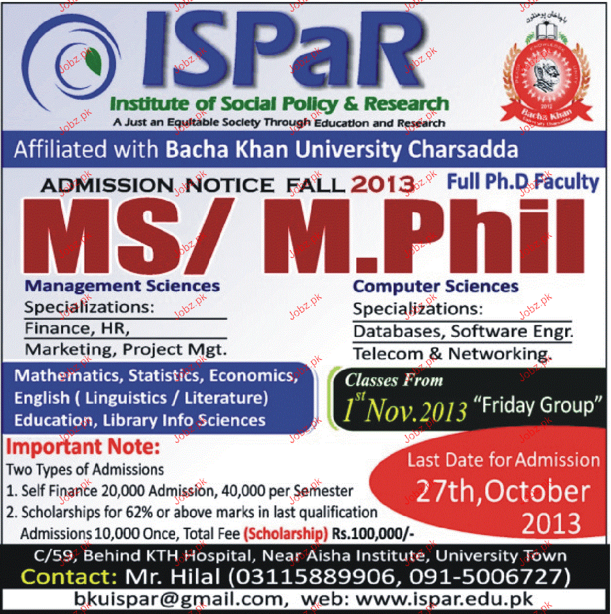 ISPAR Institute of Social Policy & Research Admission in MS / Mphill in Peshawar Read newspaper ad for exact details.