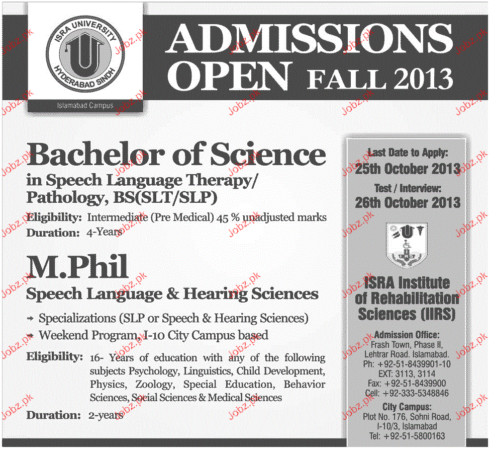 Isra University Admission in BSc and Mphill in Hyderabad Read newspaper ad for exact details.