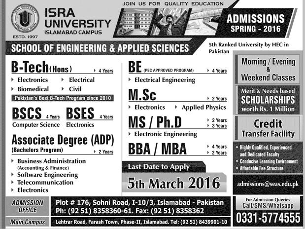 ISRA University Admission in BSCS, BSES, BE and Phd in Islamabad. Read newspaper ad for exact details.