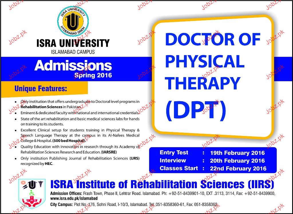 ISRA University Admission in DPT in Islamabad. Read newspaper ad for exact details.