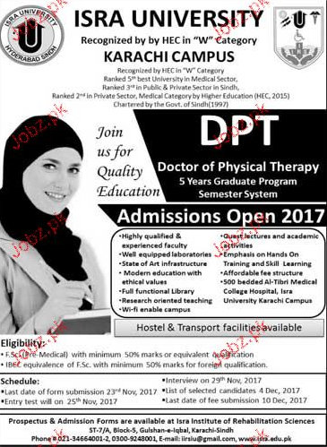 ISRA University Admission in DPT Doctor of Physical Therapy Five Year Graduate Program Semester System in Karachi. Admission Open for Both Male / Female Students Read newspaper ad for exact details.