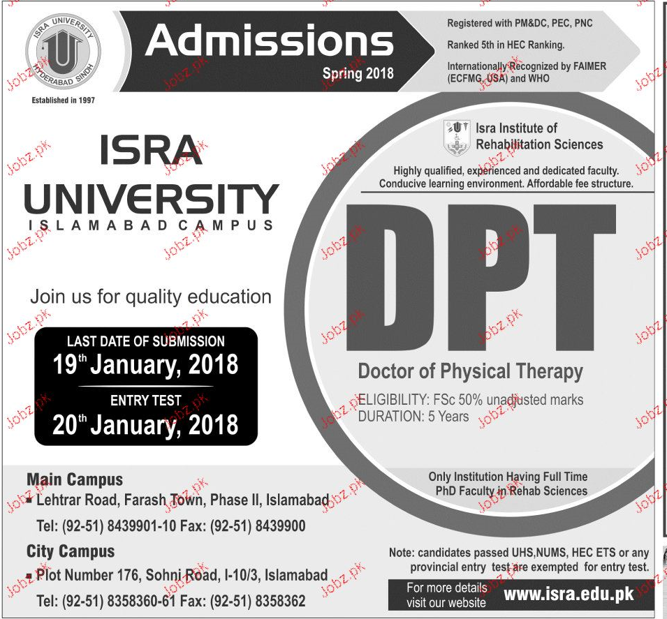 ISRA University Admission in DPT Doctor of Physical Therapy in Islamabad. Last date for submission of admission forms is 19 January 2018. Entry Test will be held on 20-01-2018. Read newspaper ad for exact details.