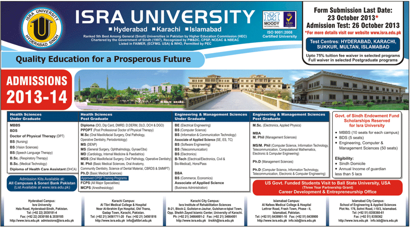 ISRA University Admission in MBBS, BDS, BSC, BS and MS in Lahore Read newspaper ad for exact details.