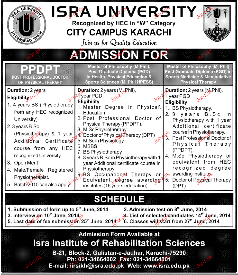 ISRA University Admission in PPDPT in Karachi. Read newspaper ad for exact details.