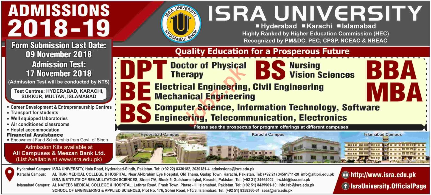 ISRA University Karachi, Pakistan are opening admissions fall 2018 for the classes of DPT, BE, BS, BBA, MBA. Last date of receipt of duly filled in application form is 9th November 2018 during office hours. Read newspaper ad for exact details.