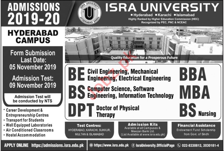Isra University has announced admissions in BE Civil Engineering, Mechanical Engineering, Electrical Engineering, BS Computer Sciences, Software Engineering, Information Technology, Doctor of Physical Therapy DPT, BBA, MBA BS Nursing in Hyderabad, Karachi and Islamabad. Read newspaper ad for exact details.