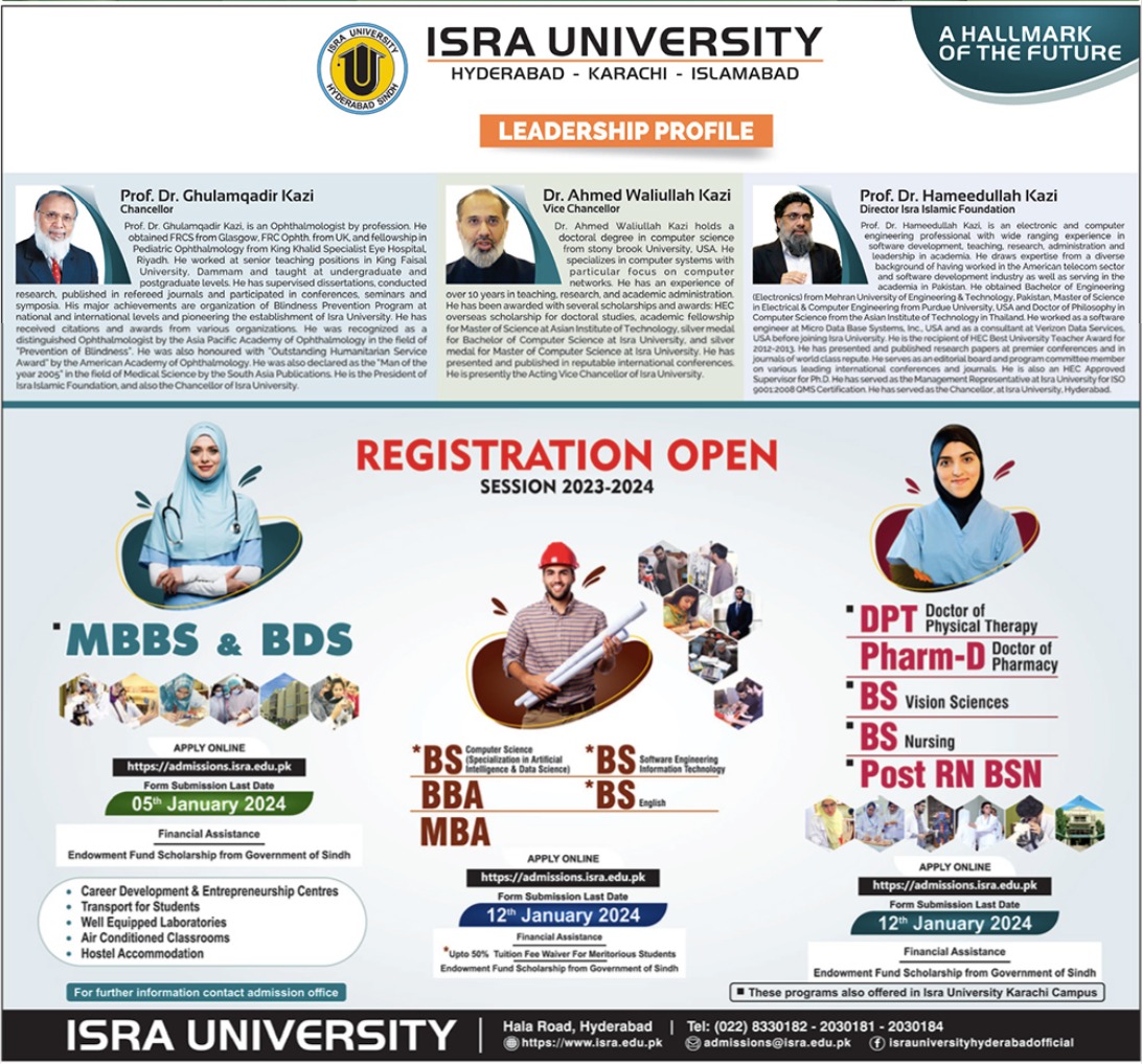 ISRA University Doctor of Physical Therapy DPT, Pharm D, BS, BSN, Post RN BSN, BBA, MBA, MBBS and BDS admissions 2024 has been started. Students who want to take admissions in ISRA University Hyderabad Sindh Pakistan for academic year 2024 to continue education in Science University can apply. Eligible students for fulfilling criteria for admissions in BSN, BDS, BS, BBA, DPT, Pharm D and Others can enroll as per Government admission policy 2024 till closing date 12 January 2024. Read newspaper ad for exact details.
