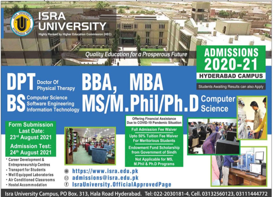 ISRA University is a private sector university has announced admissions in Doctor of Physical Therapy DPT, BBA, MBA, BS, MS, M.Phil and PhD Computer Science degree programs 2020-2021. Read newspaper ad for exact details.