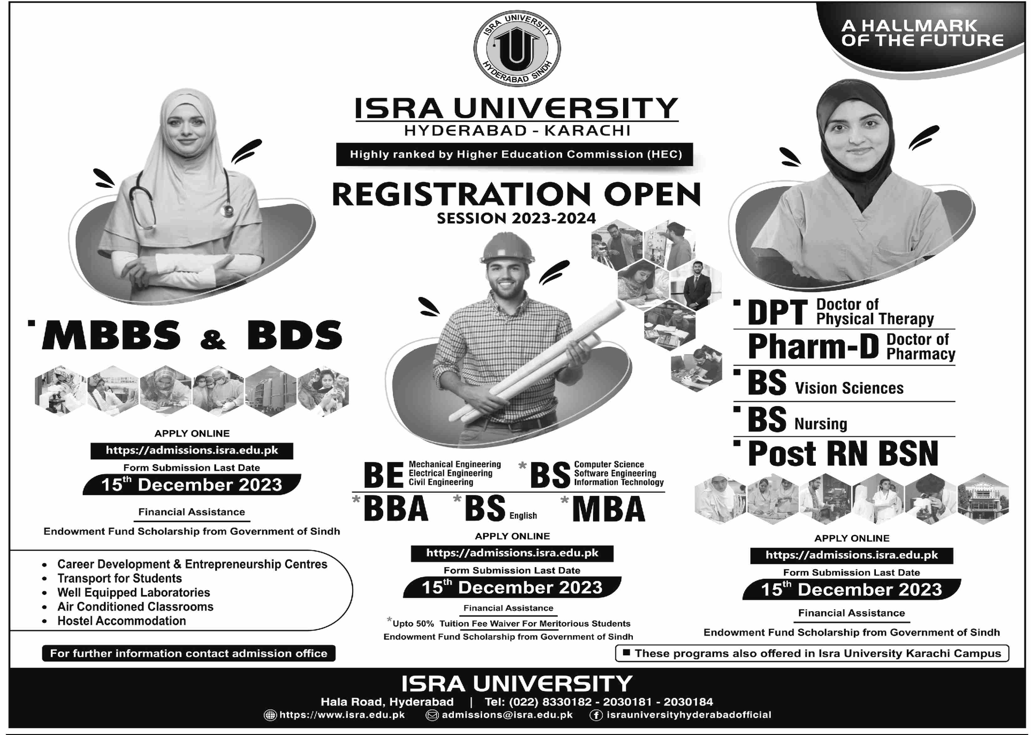 ISRA University has announced admissions 2023 for DPT, PharmD, BS, Post RB BSN, BE, BSN, BBA, MBA. Students can enroll for admissions in ISRA University Karachi Hyderabad Sindh Pakistan for academic year 2023 to continue campus based or online education in Science University. Students who want to enroll for academic session 2023 in BSN, Phd, DPT, BBA, MBA, BS and Pharm D qualification and admission criteria for Government institute can apply till last date 15 December 2023. Read newspaper ad for exact details.