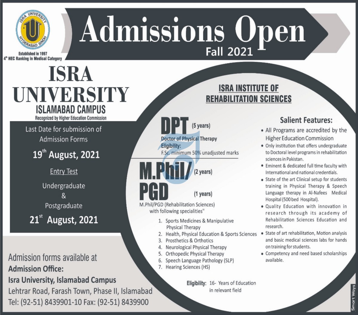 ISRA University Islamabad Campus has announced admissions in Doctor of Physical Therapy DPT, M.Phil and PGD in Isra Institute of Rehabilitation Sciences 2021. Read newspaper ad for exact details.