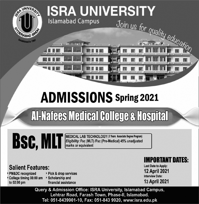 Al Nafees Medical College & College, Isra University Islamabad Campus invited application for admission in BSc Medical Lab Technology MLT 2 Years Associate Degree Program 2021. Read newspaper ad for exact details.