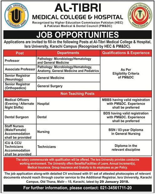 Al Tibri Medical College & Hospital is currently looking for highly qualified and medical candidates for the posts of Professor, Associate Professor, Senior Registrars, Medical Officers, Dental Surgeon, Staff Nurses, ICU & CCU Technicians in Karachi, Sindh. The interested candidates apply as per given criteria.