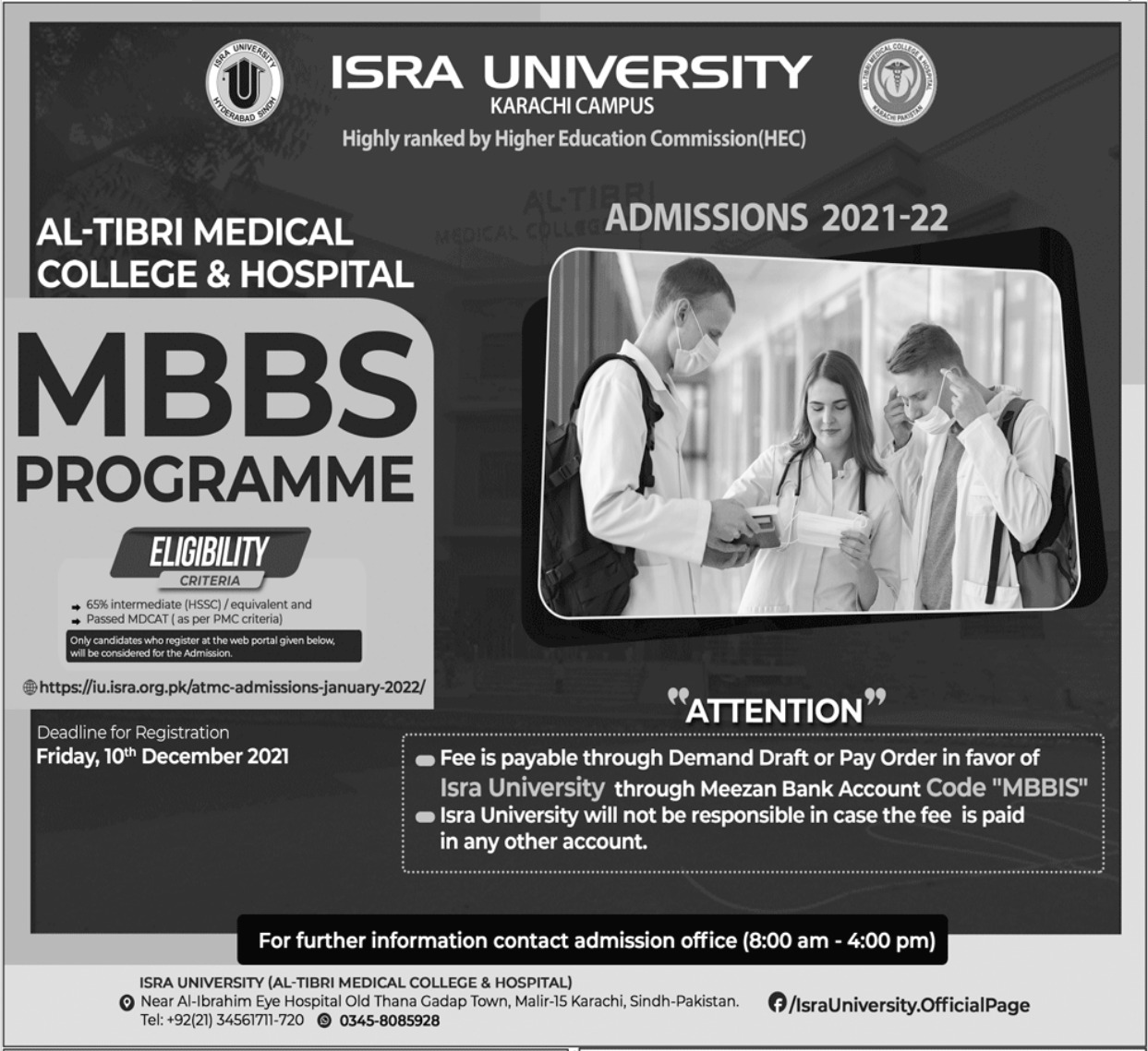 ISRA University is offering admissions in MBBS Program for 2021-22. The students having 65% marks are eligible to apply. Last date for registration is 10th December 2021. Read newspaper ad for exact details.