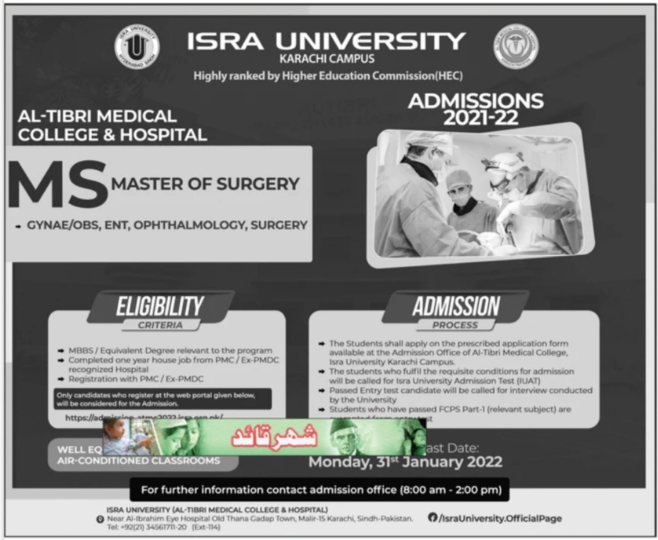 ISRA University Karachi Campus is offering admissions in the disciplines of MS Master of Surgery in Gynae, Obstetrics, ENT, Ophthalmology and Surgery at Al Tibri Medical College and Hospital. The students should have MBBS qualification or equivalent degree. Read newspaper ad for exact details.