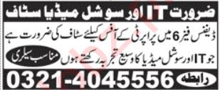 Vacant posts including social media staff and it staff are announced in Private Company Lahore, lahore Punjab Pakistan as per 8 October 2023 advertisement in daily Jang Newspaper. Bachelor and Intermediate etc. educational qualification will be preferred.